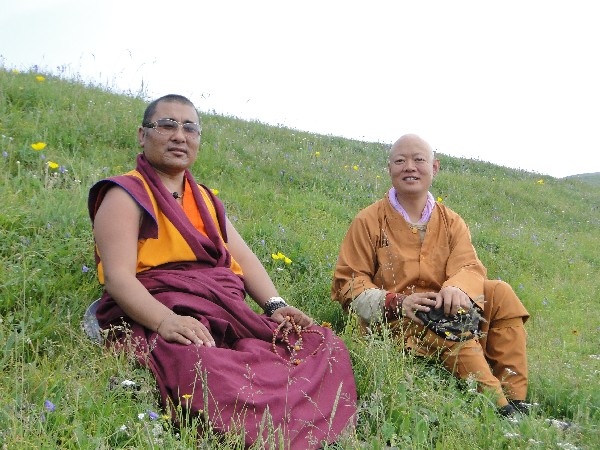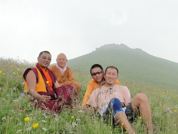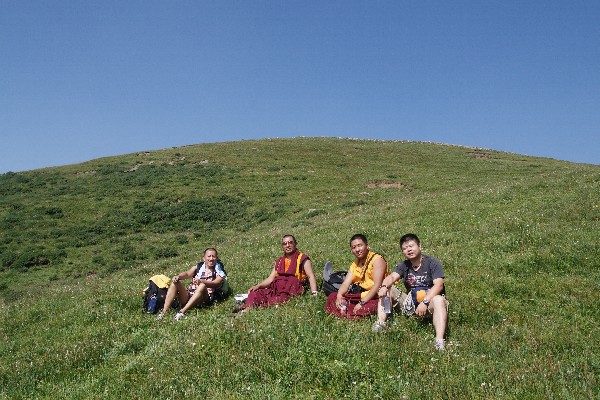 菩康法王徒步转山朝台第四日,圆满转绕五台后,下山途中与五台山出家弟子国华师、侍者及随行弟子在山坡小憩