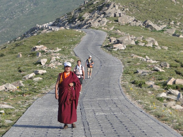 菩康法王徒步转山朝台第四日,与随行弟子于北台至东台的盘山公路上