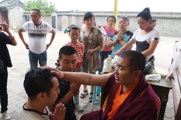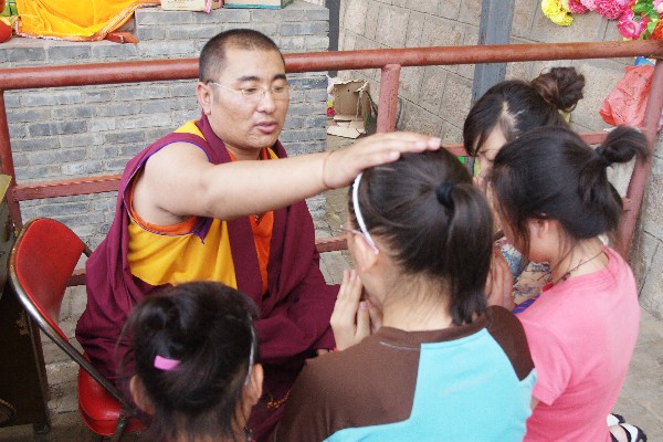 菩康法王徒步转山朝台第一日,于佛母洞前为朝拜的信众摸顶加持