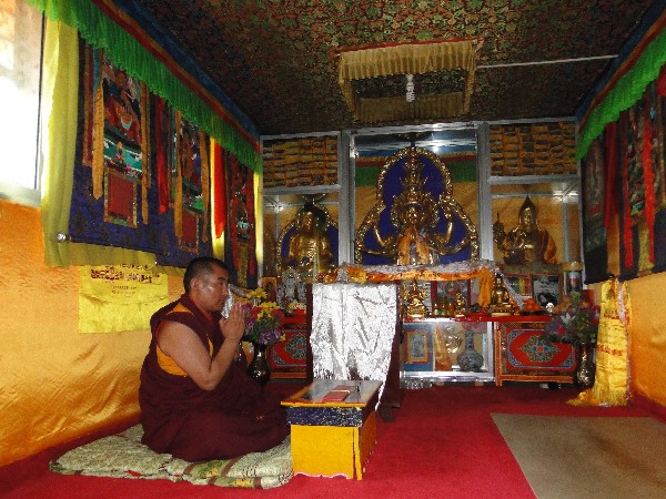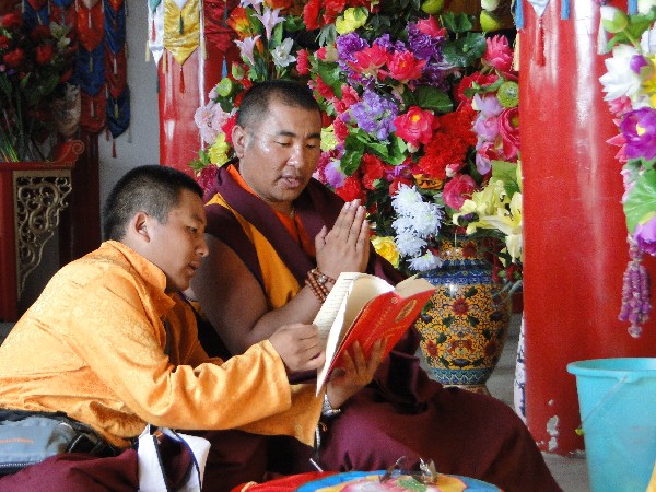 菩康法王徒步转山朝台第三日,于中台演教寺大殿中诵经